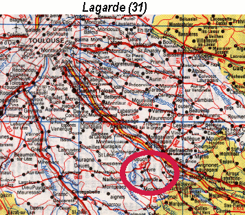 Situé sur le point culminant du Lauragais Haut-Garonnais, juste en limite du département de l'Aude et exposé aux coups de vent les plus forts (Autan principalement), LAGARDE se repère de loin. Actuellement, se sont la hauteur de sa situation, son clocher mur et son château d'eau qui le distinguent sans erreur possible de tous les villages environnants. Cette situation dominante valut à LAGARDE d'être remarqué très tôt pour y installer bien sur un poste d'observation et de garde. |